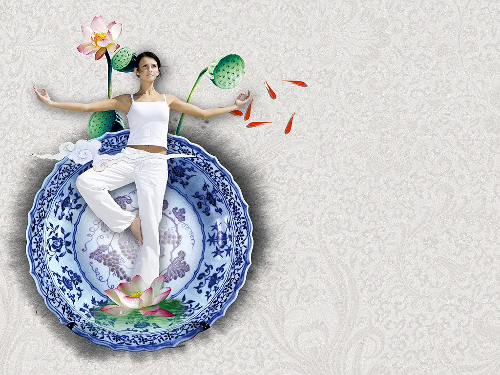 太極美女青花瓷背景中國風PPT模板