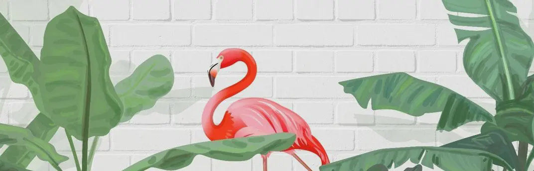 有綠葉和紅色火烈鳥背景的小清新PPT模板