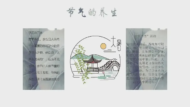 PowerPoint模板內容頁,使用了夏季自然風景圖片、養生食物等插圖,搭配大暑節氣介紹文字排版。