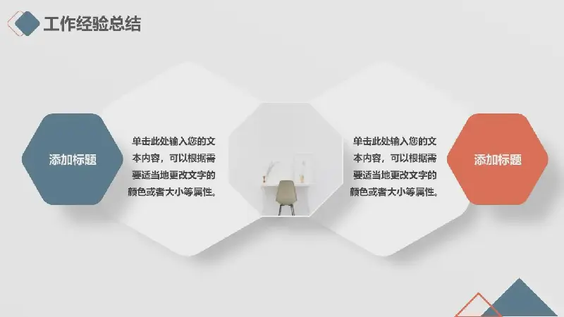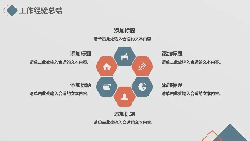 PPT模板的內容頁由22張藍橙配色的幻燈片圖表與PPT文本佈局組成。另外還使用了桌面插圖、商業建築插圖和自然景觀插圖等裝飾。
