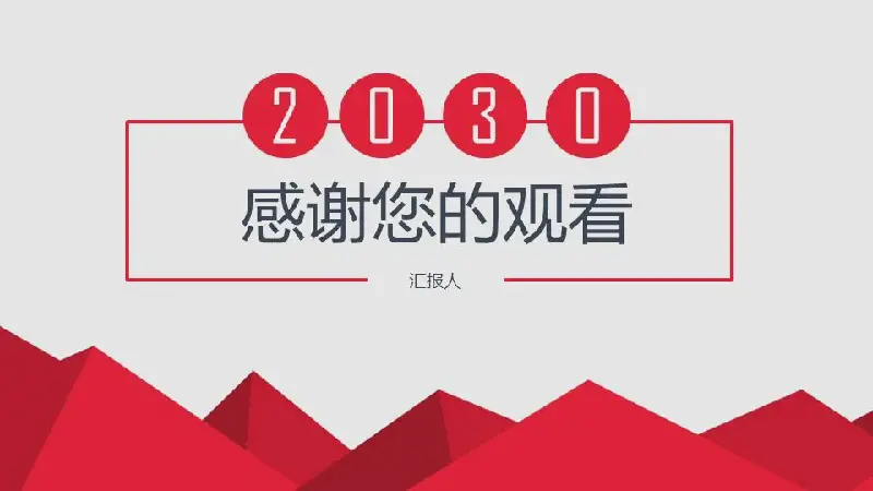 PPT模板封面,採用多個紅色三角形拼接而成,類似於山形的多邊形背景圖片。中間放置了一個紅色的圓圈,用來填充報告年份,以及新年工作計劃PPT標題文字。界面設計簡潔、實用。
