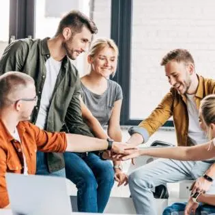 PPT模板封面採用三個職場人物正在辦公室交流的背景圖片。中間用藍色字體填入工作總結報告PPT標題文字。下方用藍色和紅色的曲線進行裝飾。