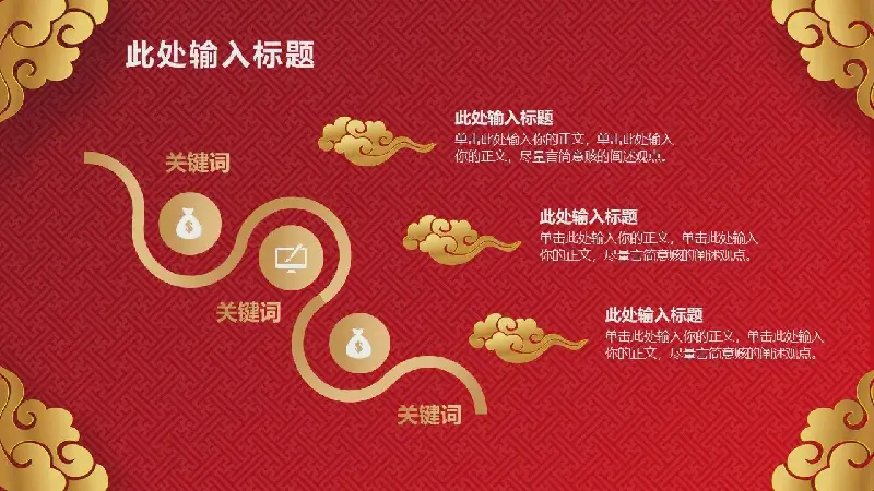 該PPT模板使用紅色和金色作為主題色。它的四面都有金色的雲朵裝飾。界面非常漂亮,很有節日氣氛。