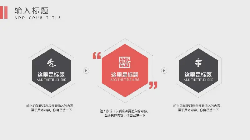 PowerPoint模板內容頁,由24張紅色黑色配色的幻燈片圖表,搭配PPT文字排版。另外使用了寫字樓建築插圖、職場辦公插圖、握手圖片等裝飾。