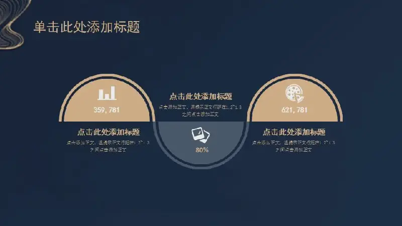 幻燈片模板使用了深藍色作為底色,上方以極具創意的等高線樣式的線條作為裝飾。線條優雅精緻,非常具有創意。幻燈片模板內頁使用了金色扁平化設計風格,製作了整套PPT圖表,非常實用。