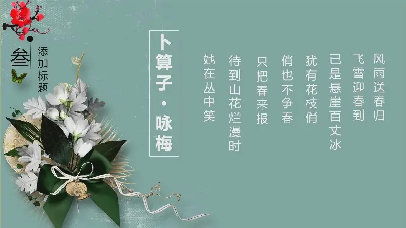 PPT模板的內容頁採用多幅花草PPT插圖、鳥類PPT插圖,用古詩詞製作。