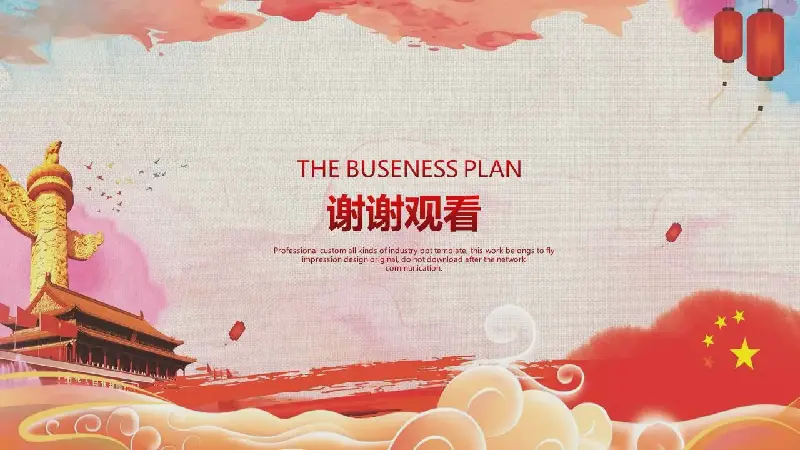 PPT模板封面,放置了彩色水彩光環圖案、祥雲圖案、中國桌、天安門、燈籠等背景元素。中間放置金色的立體 "永遠跟黨走 "PPT藝術字樣作為標題文字。界面大氣、精緻。