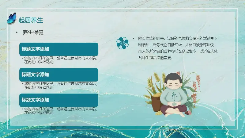 PowerPoint模板內容頁,使用了春天的植物、昆蟲、鍛鍊身體的兒童等插圖,搭配節氣介紹文字排版。