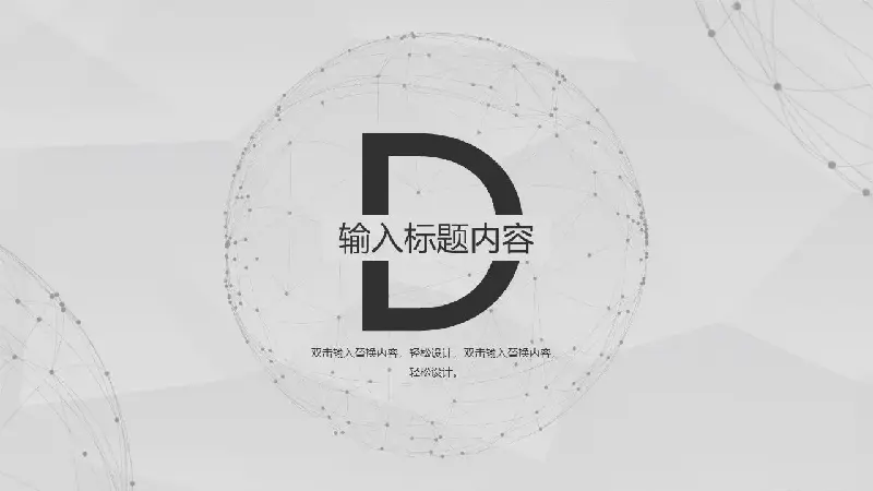 幻燈片模板封面,使用了一個灰色的低平面多邊形作為基礎圖片。中間使用了一個由粒子點狀鏈接組成的星球圖案作為背景圖片。在粒子星球內填入商業演示PPT的標題文字。界面設計簡單而富有商業氣息。