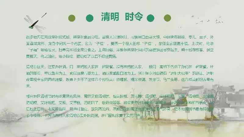 PowerPoint模板內容頁,使用了清明時節的自然風景插圖、活動插圖、飲食插圖等,搭配節氣介紹文字排版。