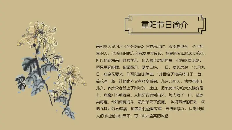 PPT模板的內容頁介紹了重陽節的節日簡介、民俗風情、神話傳說、名詩名句等。並用墨菊、酒罈、竹子、古建築、登山等插圖進行裝飾。