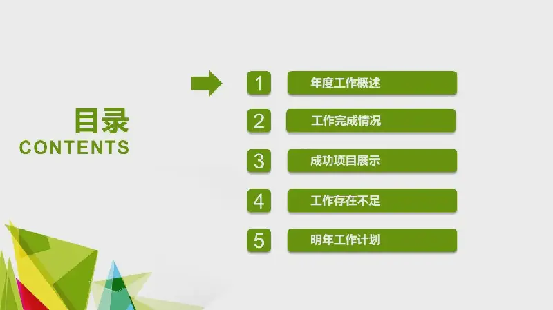 關鍵詞:多彩的多邊形、三角形PPT背景圖片、綠色平面幻燈片圖、動態年中工作總結PPT模板、.PPTX格式;