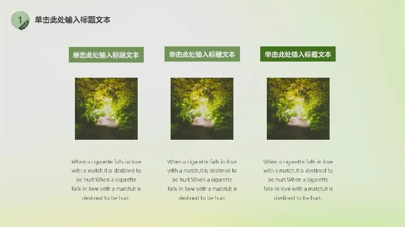 PPT模板的內容頁由25張綠色動態幻燈片圖表組成,PPT文字佈局。還使用了幾幅樹的插圖、葉子的插圖和其他裝飾。