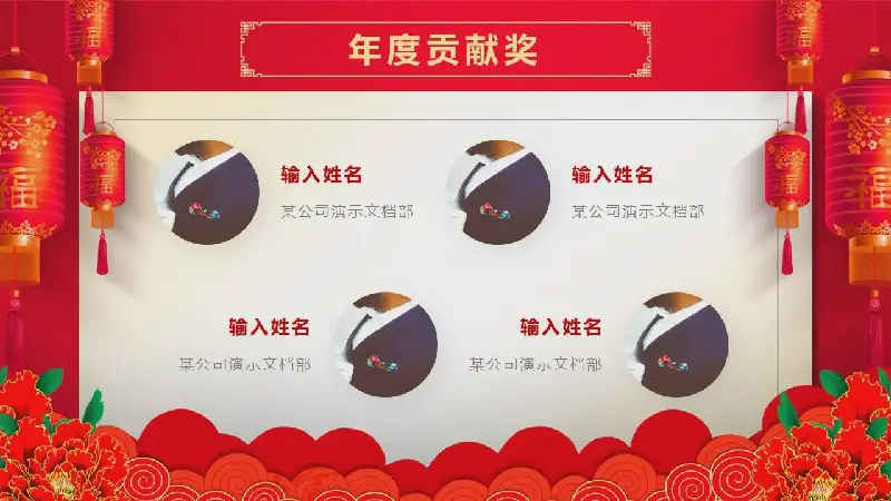 幻燈片模板採用紅色和金色,頁面元素包括:燈籠、祥雲圖案、富貴牡丹、窗簾等。年度儀式PPT的標題用金色毛筆字體填入。整個幻燈片模板設計得非常漂亮。