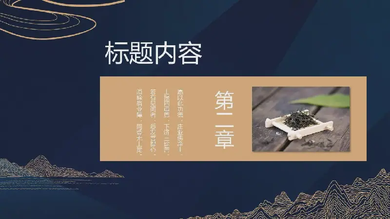 PPT模板封面,使用了深藍色背景色。上面放置金色曲線風格的群山、雲朵等PPT背景圖。中間填寫PPT標題文字。界面大氣高端雅緻。