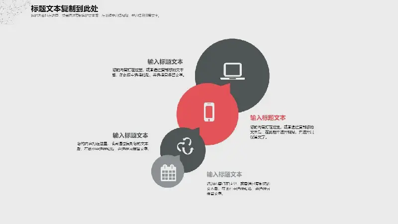 幻燈片模板封面,採用灰色點線粒子圖片作為基礎圖片。中間四個紅灰相間的微立體圓形按鈕,用於填寫PPT彙報時間,下面填寫商務演示PPT標題文字。界面設計簡潔、實用。