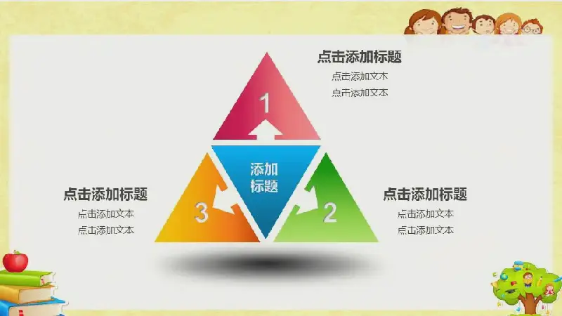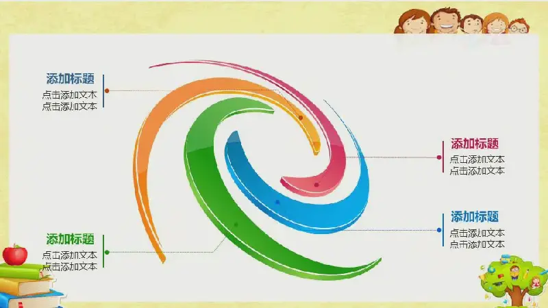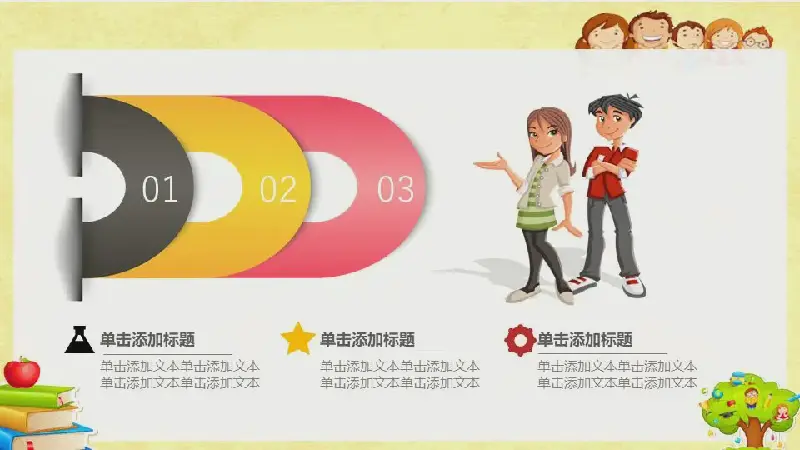 幻燈片模板封面,使用了一排可愛的兒童、卡通書籍、蘋果、鉛筆等元素作為背景。在中間填寫兒童成長教育PPT標題文字。