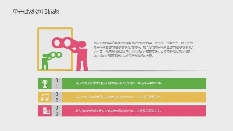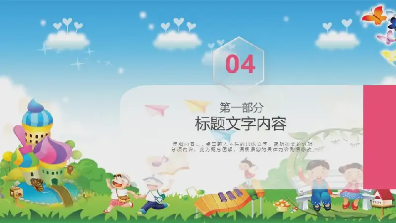 PPT模板的內容頁由23張彩色的動態幻燈片圖表組成,採用PPT文字佈局。此外,還使用了幾張兒童節活動的照片插圖作為裝飾。
