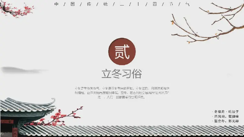 這是一套古建築梅花背景的立冬節氣介紹PPT模板,共22頁;