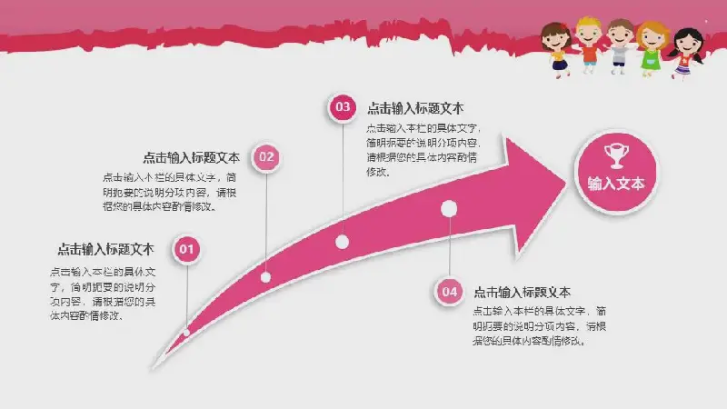 幻燈片模板封面,採用了一組手拉手快樂玩耍的小朋友作為背景元素,另外還採用了粉色愛心樹作為裝扮。中間則是一個快樂的兒童節PPT標題。界面設計卡通化,充滿童趣。