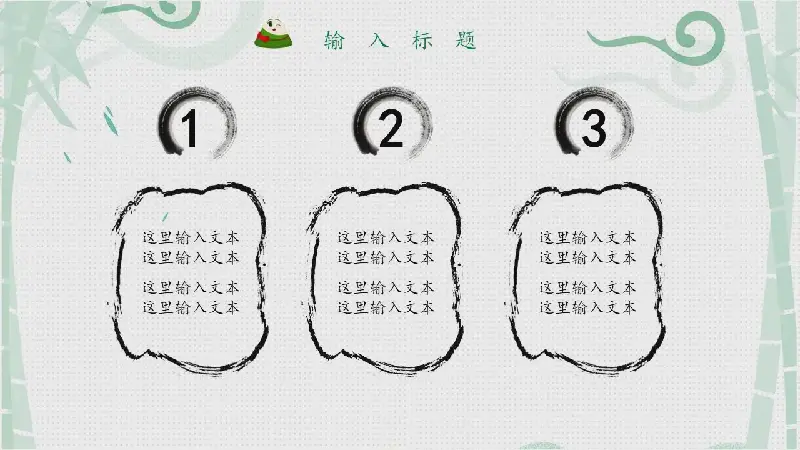 幻燈片模板的封面,採用淺綠色竹林圖案作為背景圖片。左下角放置了粽子的圖片,中間用毛筆字書寫了粽子的PPT藝術字。界面設計簡潔、清新。