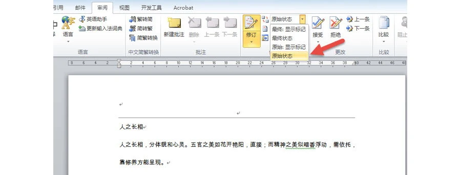 如果將其設置“原始狀態”,則完美顯示文檔沒修改前的狀態。(實際上文檔已修改,只是查看方式為原始狀態,也就是我們所說的初稿),彷彿文檔沒有被修改過。
