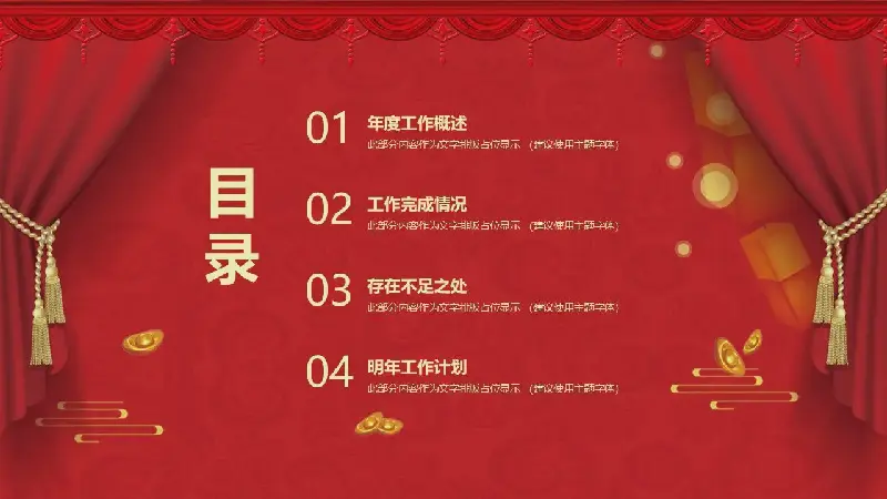 PowerPoint模板內容頁,使用了招財貓、鯉魚、財神等插圖,搭配PPT文字排版。