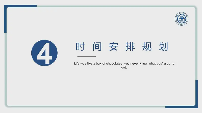 PPT模板封面,使用了有陰影效果的白色矩形卡片PPT背景圖片,周圍放置四個藍色拐角裝飾。中間填寫畢業論文開題報告PPT標題文字,右上角放置高校logo。界面非常簡潔。