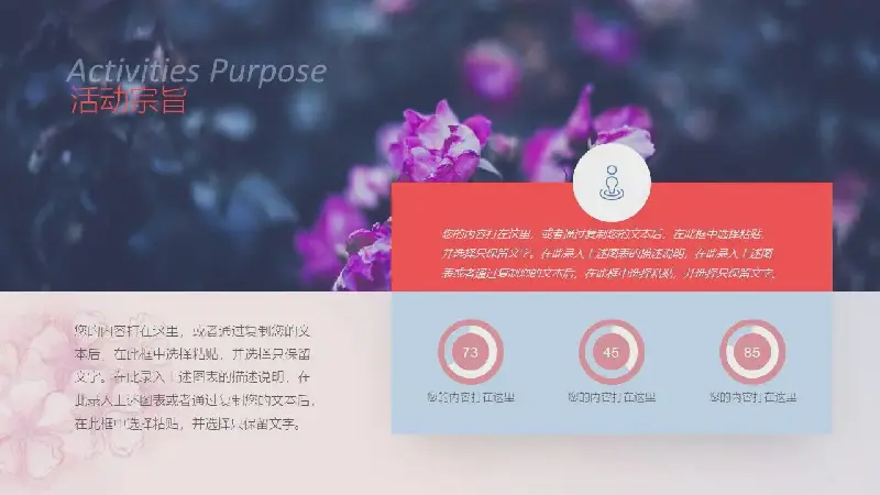 PPT模板的內容頁由23張紅色的動態幻燈片圖表組成,採用PPT文字佈局。同時採用花卉插圖、盆景插圖、花卉插圖等裝飾。