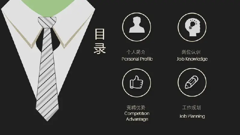 這是一套黑色西裝領帶圖形背景的,個人求職簡歷PPT模板,共22張;