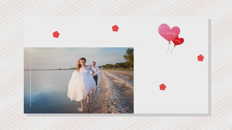 PPT模板的內容頁,使用粉色斜線背景圖片。還使用了多張情侶圖片、婚禮圖片、旅遊圖片、鮮花圖片、愛情圖片、我愛你的郵戳圖案排版。