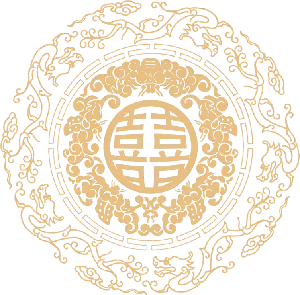 PPT模板封面採用紅色幕布,卡通新郎新娘背景圖片。中間放置了燙金的龍鳳圖案,以及金色的喜字。接口風格界面喜慶。