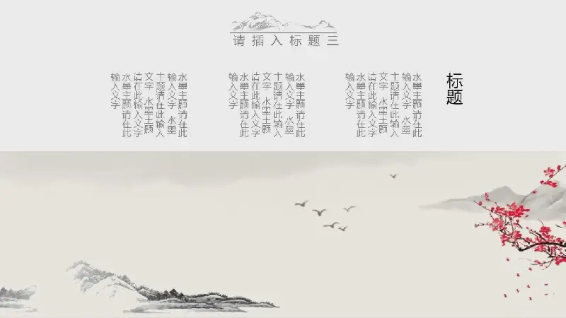 該PPT模板內容頁,與封面一致。每一頁都採用水墨國畫,文字排版簡單。包括:花鳥畫、荷花、竹子、蘭花、梅花等。