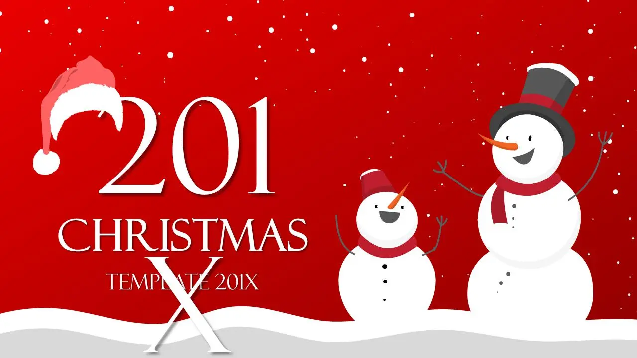 幻燈片模板使用了喜慶紅色漸變作為背景。兩個聖誕雪人在雪地裡開心的笑著,洋溢著節日的喜慶。