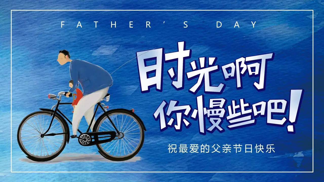 PPT模板的封面採用藍色水彩背景,背景圖片是一位父親帶著兒子騎著自行車。卡通《時間,慢點》父親節PPT標題放在右側。界面風格卡通而有趣,充滿濃濃的父愛。