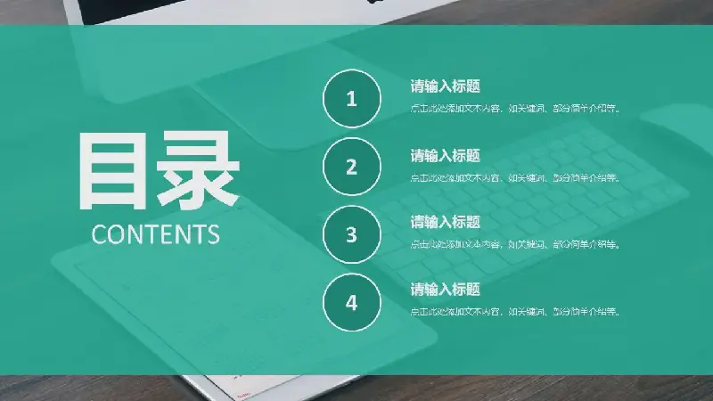 PPT模板首頁使用了蘋果電腦+iPad作為背景圖片,給人的感覺是感覺充滿科技感;