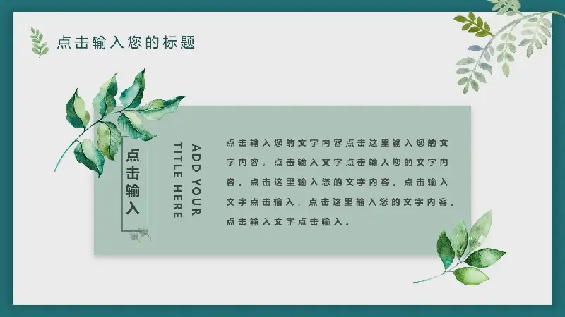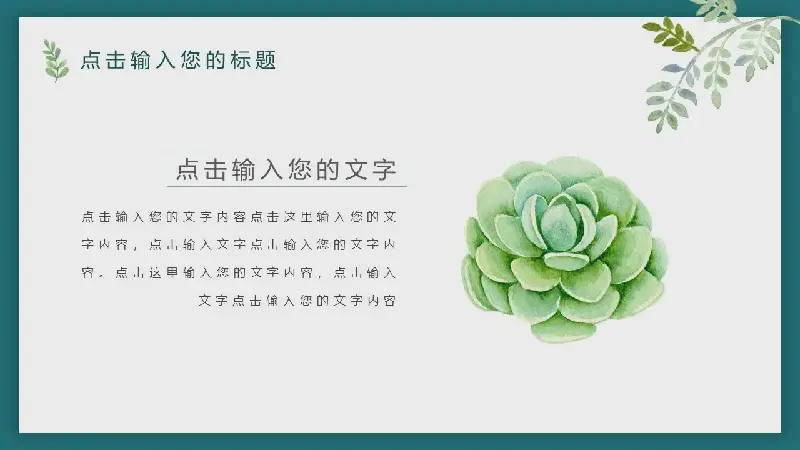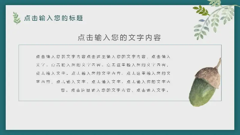 PowerPoint模板內容頁,由多個水彩植物、綠葉、堅果圖片與文字排版組成。每張幻燈片都帶有動態的PPT動畫效果。