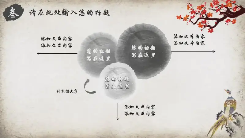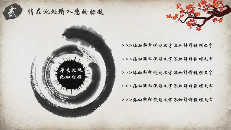 PPT模板的內容頁由25個動態的黑色水墨PPT圖表與PPT文字佈局組成。此外水墨荷花和花鳥插圖也被用來裝飾。