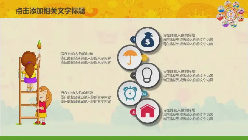 PPT模板的內容頁是由39張彩色的平面幻燈片圖表組成。此外還使用了幾張親子活動的照片進行排版。