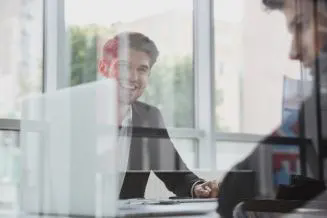 蓝色3D立体小人与齿轮背景团队合作主题PPT模板