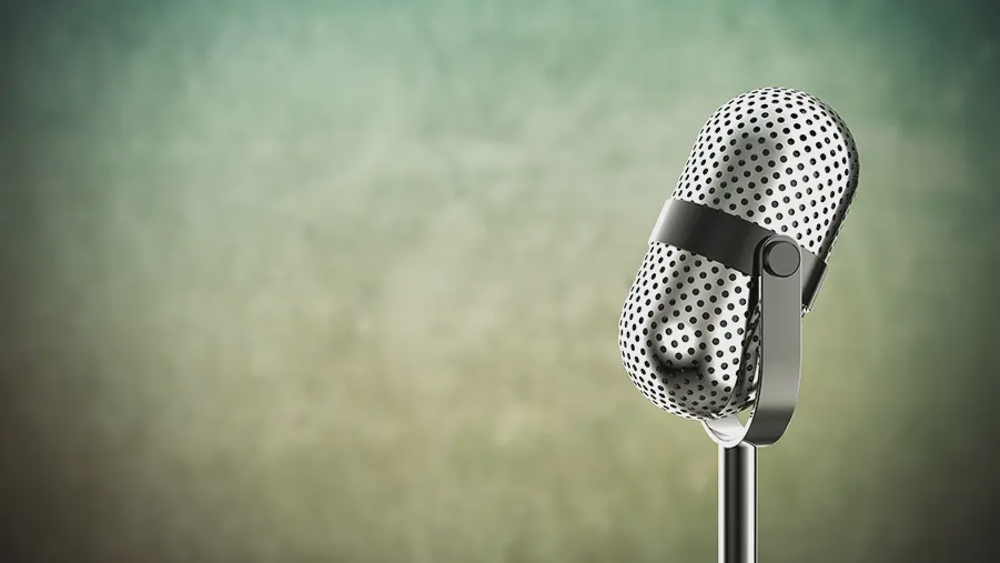 带有金属麦克风背景的大学演讲比赛PPT模板