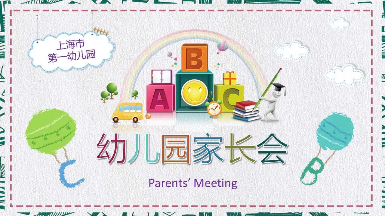 PPT模板封面采用卡通字母ABC、笑脸、热气球等背景图片。中间充满了幼儿园家长会的PPT标题。界面风格是卡通的,有趣的。