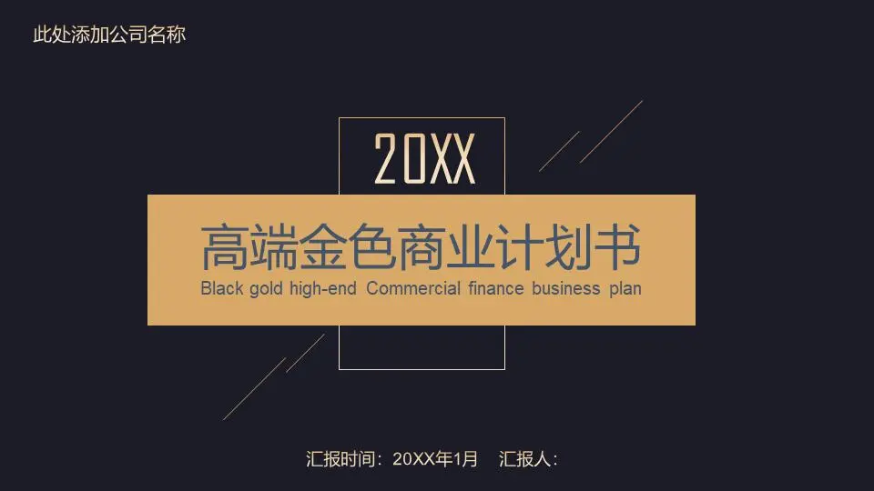 幻灯片模板封面,使用了简洁黑色背景,金色方框与斜线进行构图设计。在细线方框中间,填写商业融资计划书PPT标题。幻灯片模板界面设计精致实用,有非常浓郁的商业气息。