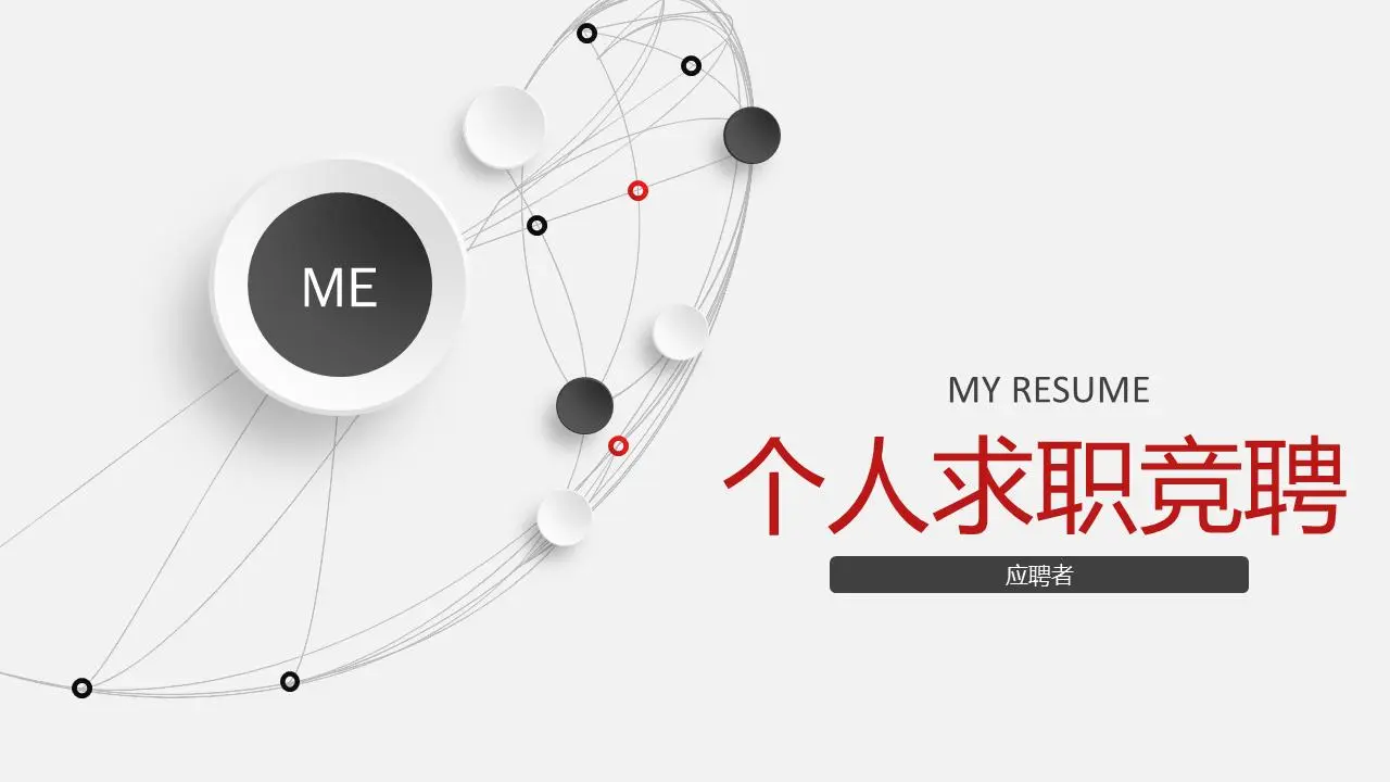 该PPT模板采用灰色背景色。PPT封面采用微立体圆和线的背景图片,右侧填充个人竞聘PPT标题。界面简洁、精致。