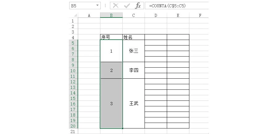 C$5:C5表示目前是从C$5开始到C5的一个单元格,那为什么前面的5要加$符号呢,就是为了让后续的引用范围自动变成二个单元格,三个单元格,以此类推。而Counta函数正好统计这些单元格额个数,自然就变成1,2,3。