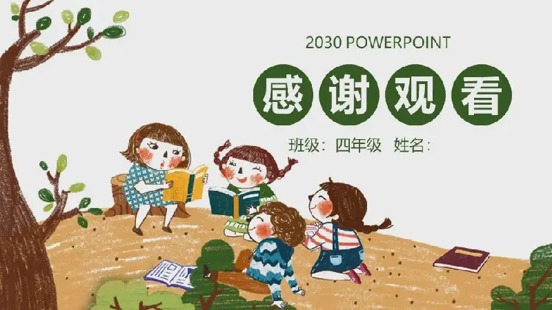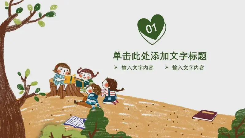 PPT模板封面,四个孩子正在一棵大树下阅读自己喜欢的书,有说有笑。右侧放置了四个圆圈,填写图书分享PPT标题。界面背景与阅读主题相呼应。