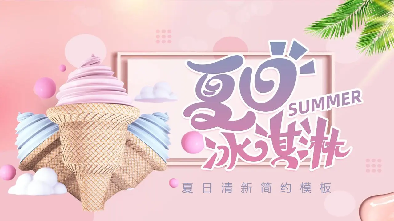 PPT模板采用浅粉色的PPT背景,三张马卡龙配色的冰淇淋PPT背景图片放置在首页左侧,中间是 "夏日冰淇淋 "PPT艺术字。界面卡通可爱,与夏天的PPT主题相匹配。